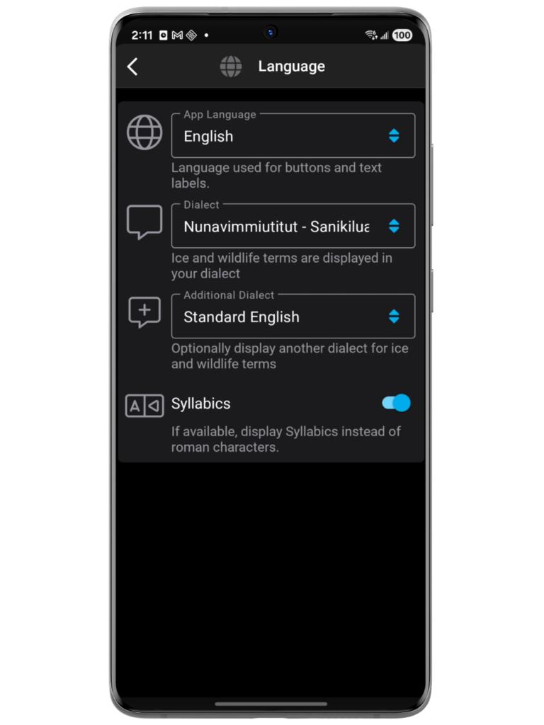 - Language and Dialect settings support localization of the entire app with support for Indigenous terminology (Wildlife, Ice & Snow, Weather & Geology) in specific dialects. (learn more)